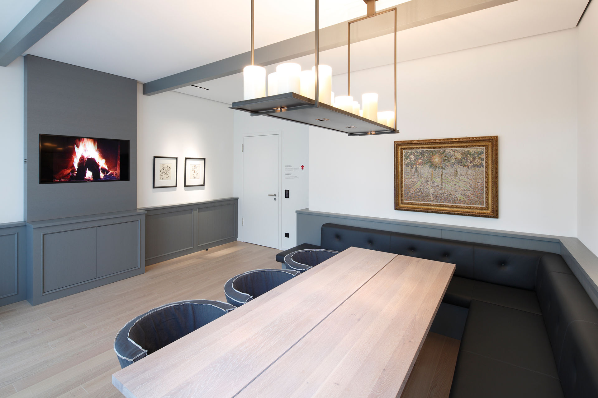 So betont ein Besprechungsraum den digitalen Wandel mit binären Codes und reduzierter Möblierung, während ein anderer Raum eine naturnahe Atmosphäre durch Blattformen an der Decke und natürliche Farben schafft. Ein dritter Raum setzt auf warme Materialien und klassische Details, wobei eine kupferfarbene Deckeninstallation als Blickfang dient. Der offene und lichtdurchflutete Empfangsbereich wird durch eine geschwungene Glasfassade und einen roten Bodenstreifen strukturiert.